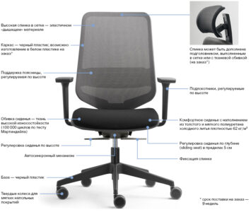 Модель снабжена автосинхронным механизмом, с возможностью фиксации спинки в 5 положениях (отклонение спинки - 20˚, сиденья - 5˚), регулировками: сиденья по высоте, сиденья по глубине ( 5 см ), поддержки поясницы ( 6 см ).