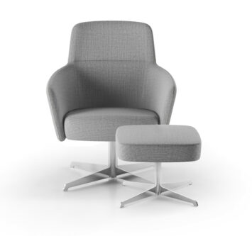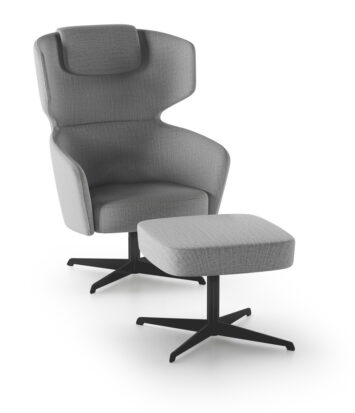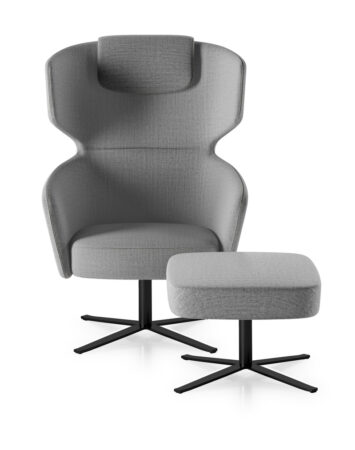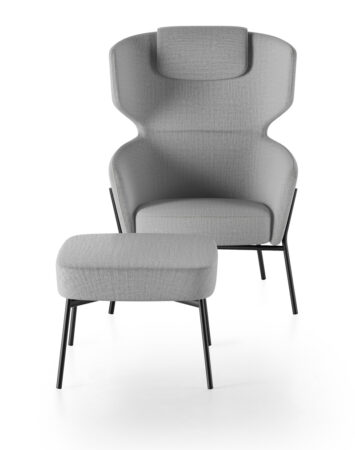 Мягкая мебель Vento представлена двухместным диваном с высокой спинкой, креслом и пуфом в ткани серого цвета.