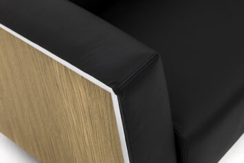 Коллекция компактных диванов и кресел Vispo Wood, в которой черная кожа сочетается с хромированным металлом и шпонированными вставками в цветах кабинета Exe — идеальный вариант для изысканного делового интерьера. Вместо традиционной для мягкой мебели кожаной обивки боковые стороны диванов и кресел Vispo Wood обиты шпонированными панелями — выглядит оригинально и необычно.