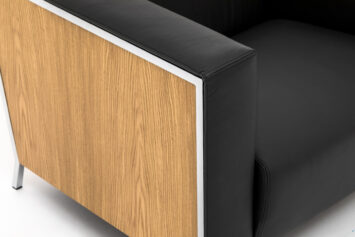 Коллекция компактных диванов и кресел Vispo Wood, в которой черная кожа сочетается с хромированным металлом и шпонированными вставками в цветах кабинета Exe — идеальный вариант для изысканного делового интерьера. Вместо традиционной для мягкой мебели кожаной обивки боковые стороны диванов и кресел Vispo Wood обиты шпонированными панелями — выглядит оригинально и необычно.