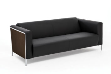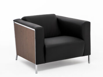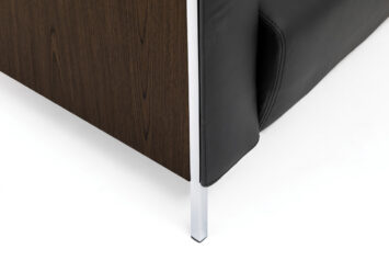 Коллекция компактных диванов и кресел Vispo Wood, в которой черная кожа сочетается с хромированным металлом и шпонированными вставками в цветах кабинета Exe — идеальный вариант для изысканного делового интерьера. Вместо традиционной для мягкой мебели кожаной обивки боковые стороны диванов и кресел Vispo Wood обиты шпонированными панелями — выглядит оригинально и необычно.