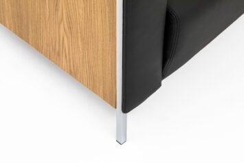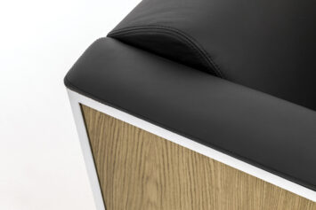 Коллекция компактных диванов и кресел Vispo Wood, в которой черная кожа сочетается с хромированным металлом и шпонированными вставками в цветах кабинета Exe — идеальный вариант для изысканного делового интерьера. Вместо традиционной для мягкой мебели кожаной обивки боковые стороны диванов и кресел Vispo Wood обиты шпонированными панелями — выглядит оригинально и необычно.